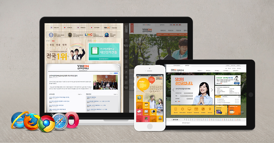 스마트 기기 사용율이 인구수의 60%를 뛰어넘은지 오래인 지금 스마트 접속환경에 대응은 필수요소!! 사용자가 어떤 OS, 웹 브라우저, 디바이스에서도 접속하여 동일한 화면을 열람할 수 있도록 전자정부 웹 표준 및 웹 호환성 지침을 준수하여 홈페이지 구축하였습니다.